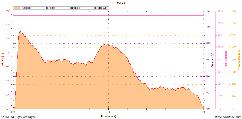 Comme je voulais poser au plus près des 10 minutes (temps imposé en F5J), j'ai utilisé les 15 dernières secondes à atterrir en partant de 20m d'altitude (on voit bien la descente finale sur le graphique).