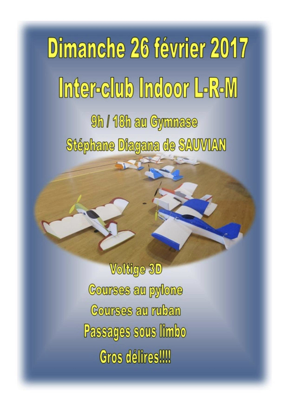 Pour info, l'interclub indoor initialement prévu le 19 février est décalé au 26 février 2017. Pilotes, spectateurs, curieux, venez nombreux ! Un spectacle à voir tout au long de la journée. Entrée gratuite.