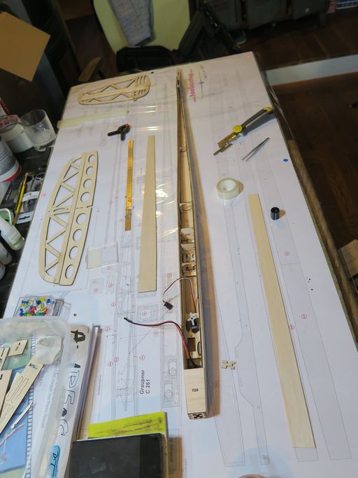 planeur poncé :-), manque les AF (attention j'imagine que si l'on veut mettre un Y pour connection au récepteur il ne faut pas montrer symétriquement les servos? comme sur le plan et inverser SP3)